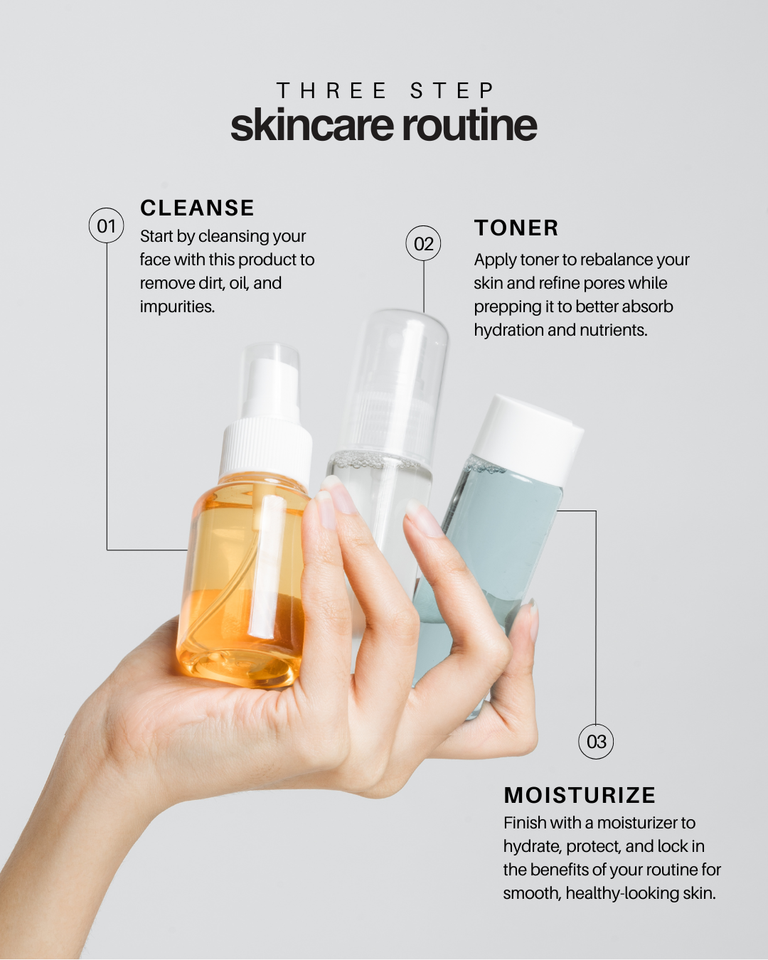 This three-step approach focuses on what your skin actually needs: a thorough cleanse, balanced prep, and lasting hydration. Each step builds on the last - helping your products perform better and your skin look smoother, clearer, and more refined over time.
